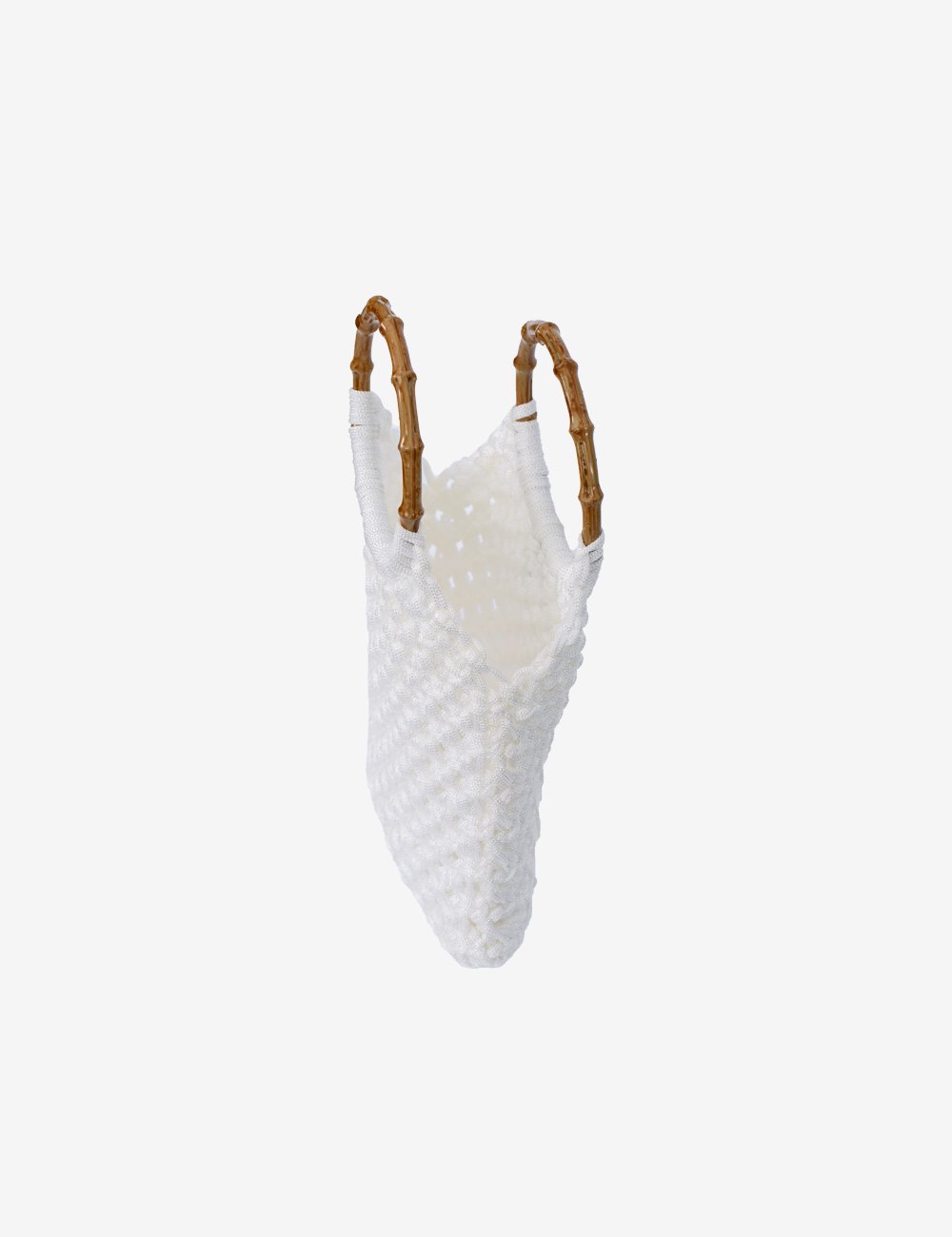 File tasarımı ve beyaz tonu ile dikkat çeken Örme çanta, pamuklu kumaşa ve çift el askısına sahiptir.