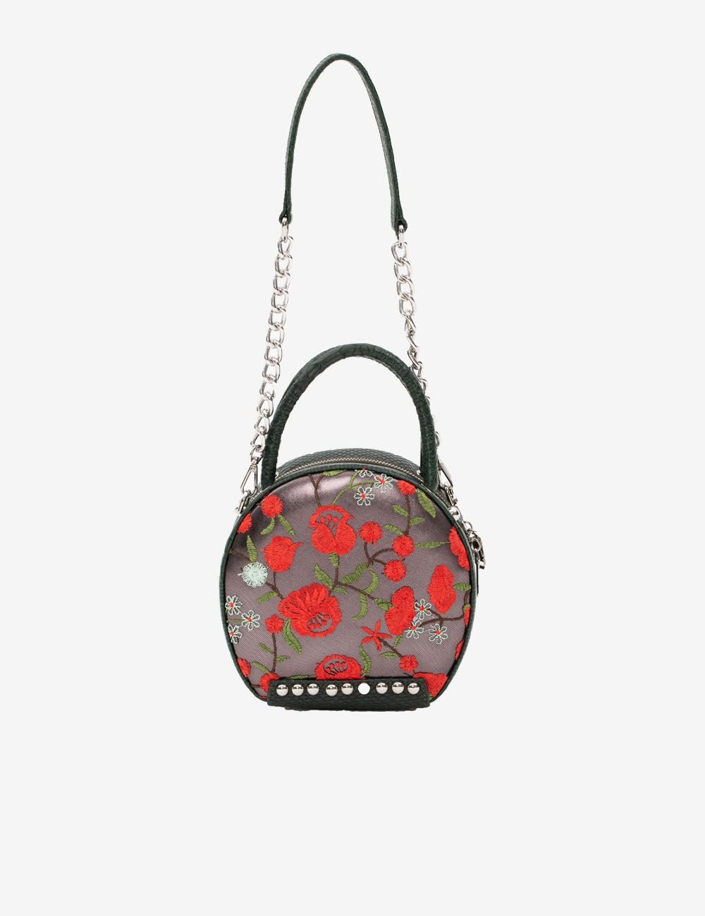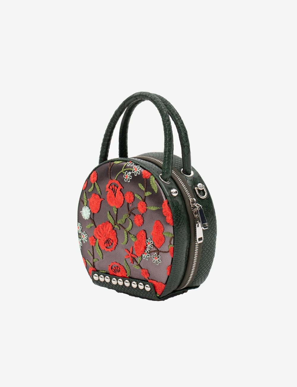 Çiçek işlemesi dikkat çeken Kumaş Scily El çantası, dana derisi ve ön-arka yüzünde çiçekli bir kumaşa, iki kulpa ve ek boyun askısına sahiptir. Günlük ve gece kullanıma uygundur.